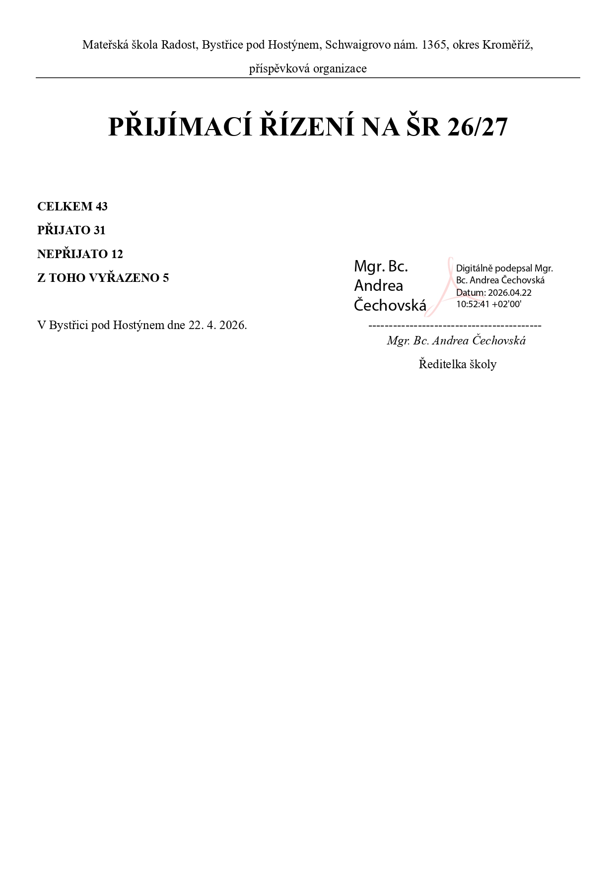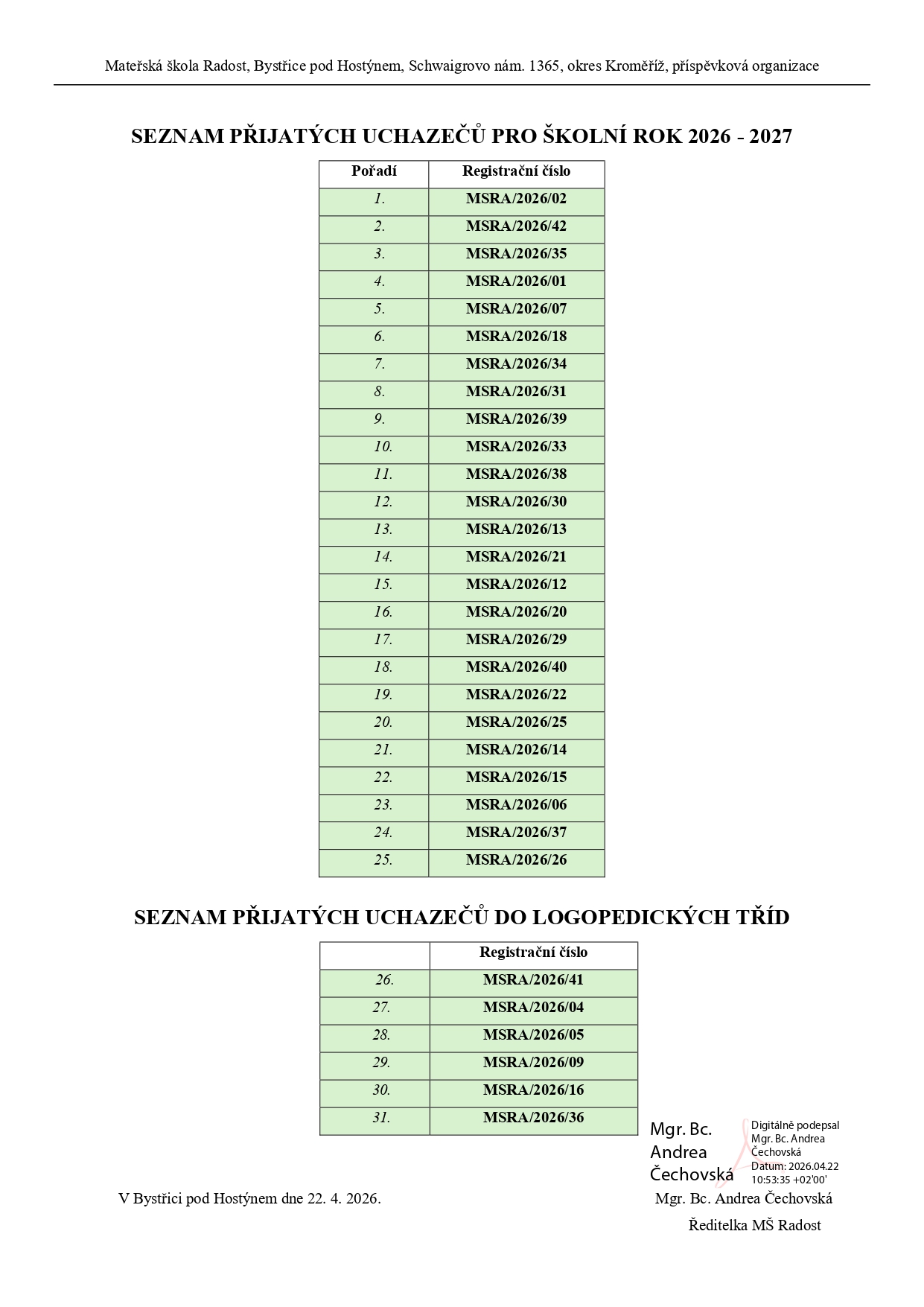 k předškolnímu vzdělávání od školního roku 2026/2027. Seznam přijatých dětí je zveřejněn pod registračními čísly, která byla přidělena při zápisu. Rozhodnutí o přijetí se považuje za oznámené zveřejněním tohoto seznamu.